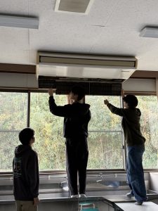 当日は、エアコンのフィルター掃除をはじめ、みんなで使用する学生玄関の床、外部講師控室の床、教室の床、トイレなど