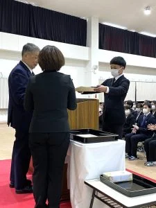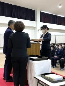 卒業を迎える学生たちは、本校の同窓会の一員として新たに入会し、同窓会長から歓迎の言葉が贈られました。