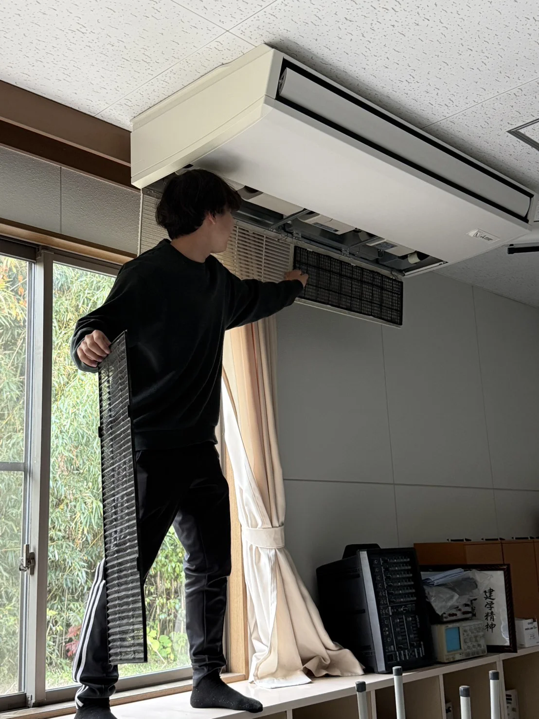 当日は、エアコンのフィルター掃除をはじめ、みんなで使用する学生玄関の床、外部講師控室の床、教室の床、トイレなど