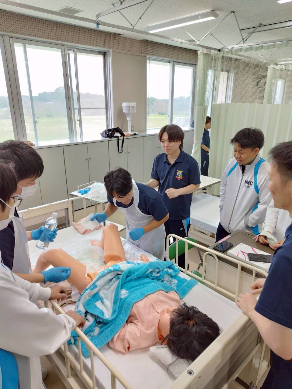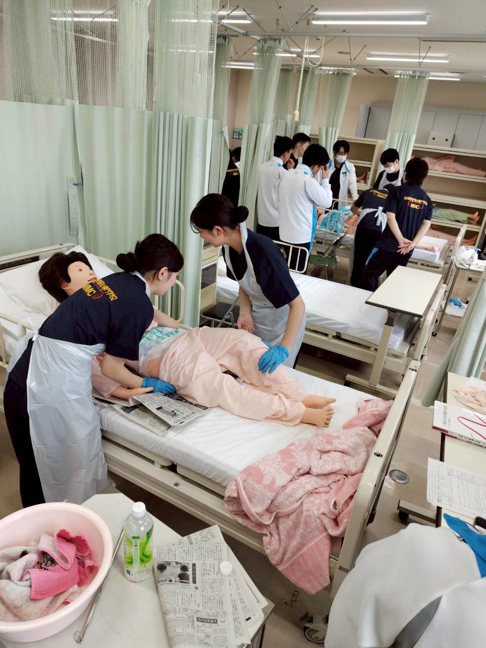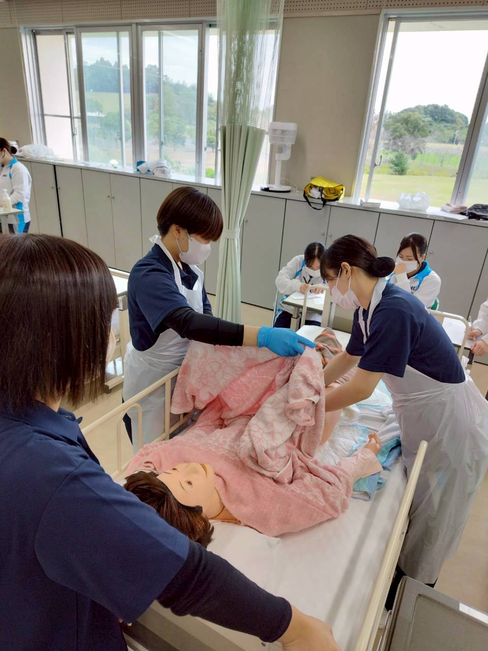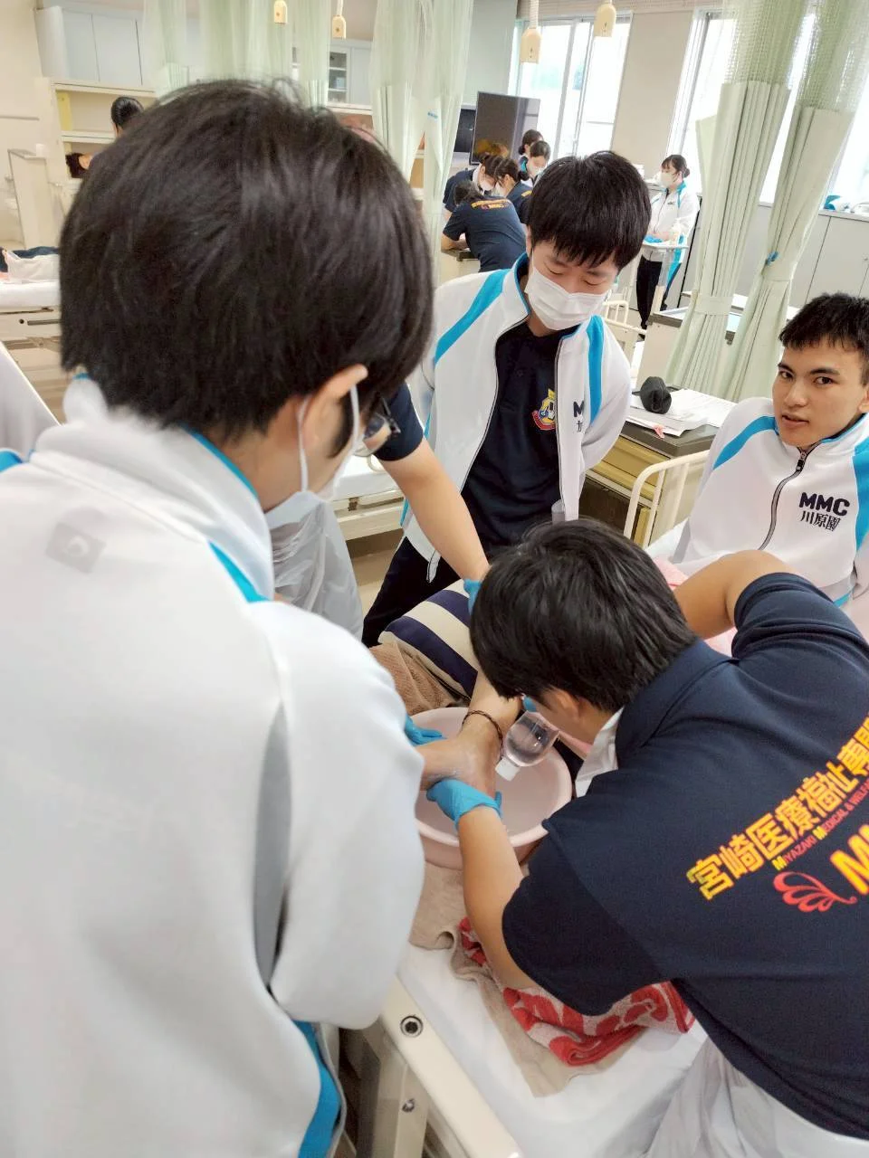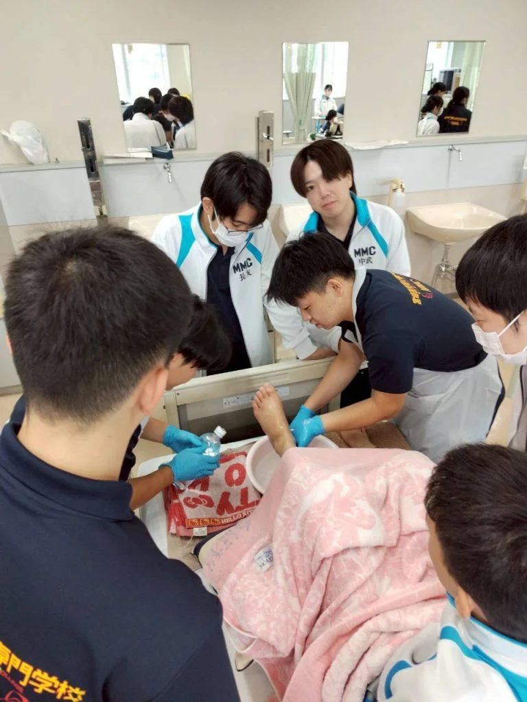 看護学科2年生が、在宅看護の授業で足浴・陰部洗浄の演習を行いました。
