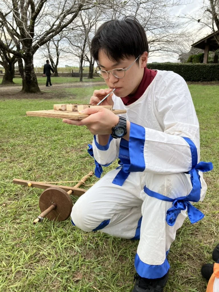 当日は火起こし体験のサポートを行い、古代人を思わせる衣装を身にまといながら活動しました。