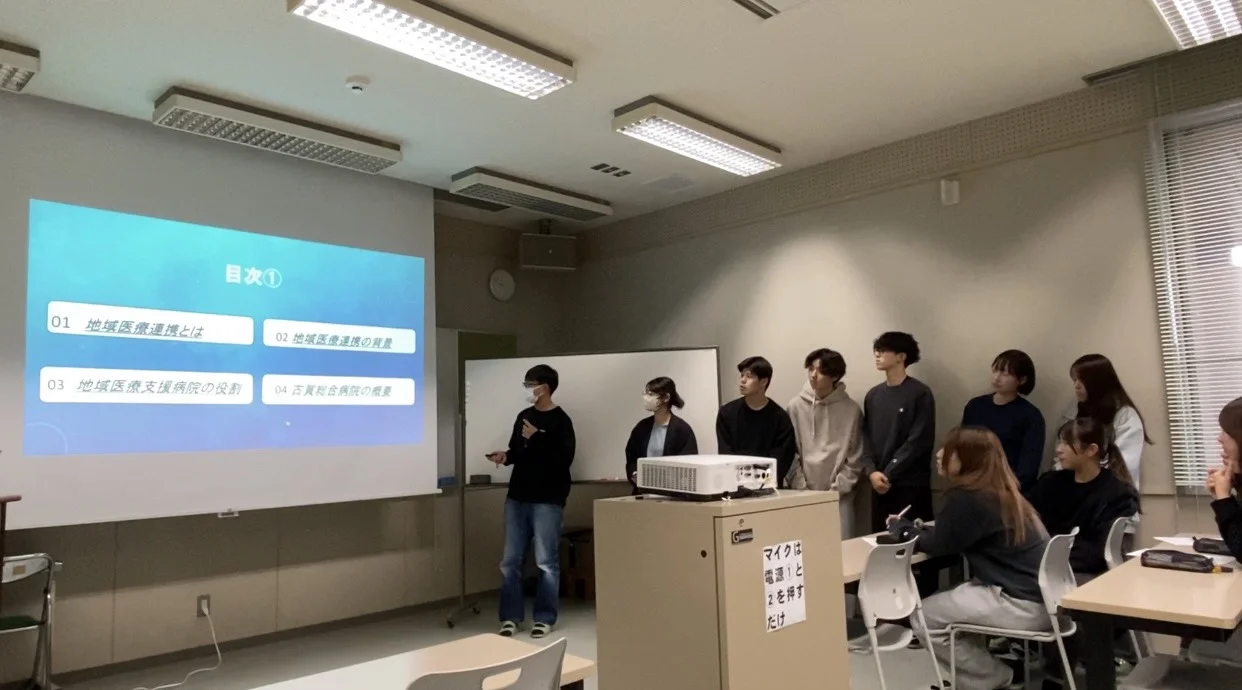 医療機関の運営をテーマに、各グループが調べた内容をスライドを用いて発表しました。
