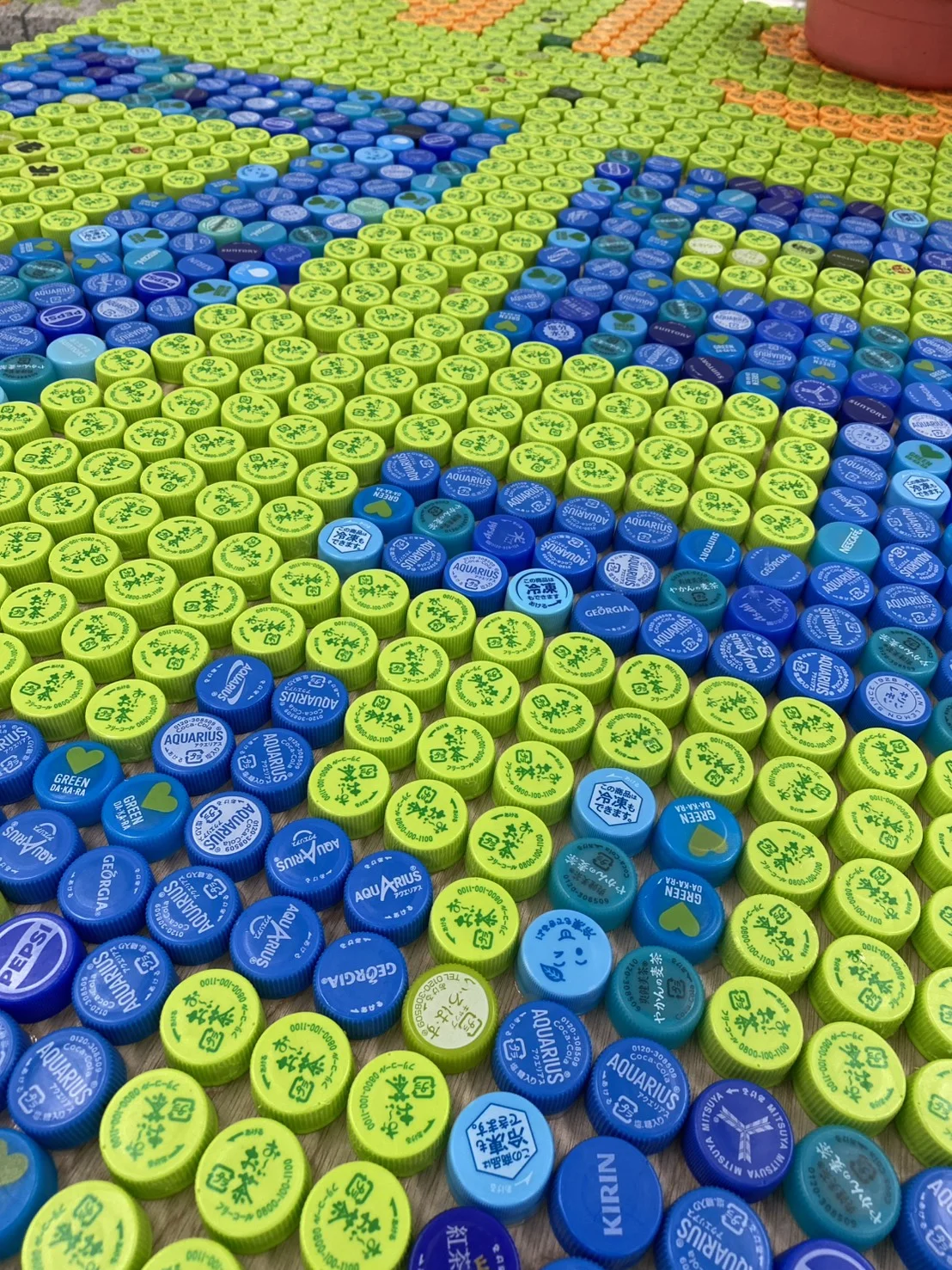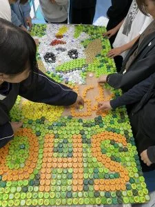 日章学園創立75周年に向けて、学生会を中心に「ペットボトルキャップアート」の制作が進められています。